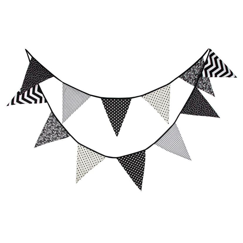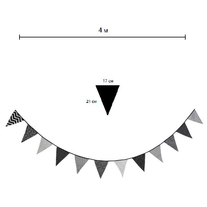 Гирлянда состоит из 12 флажков, расстояние между флажками 6 см, общая длина составляет 4 м.