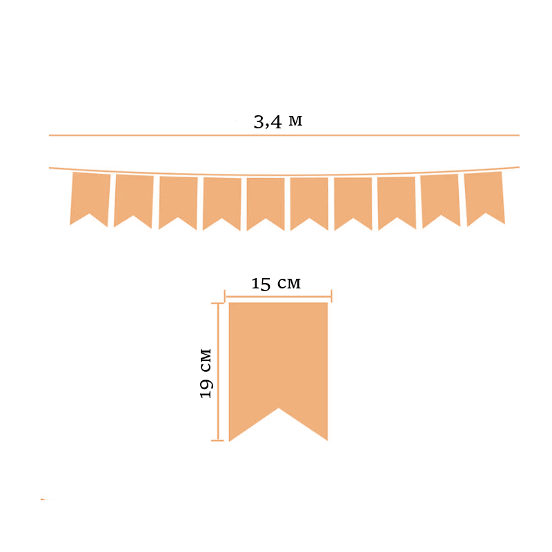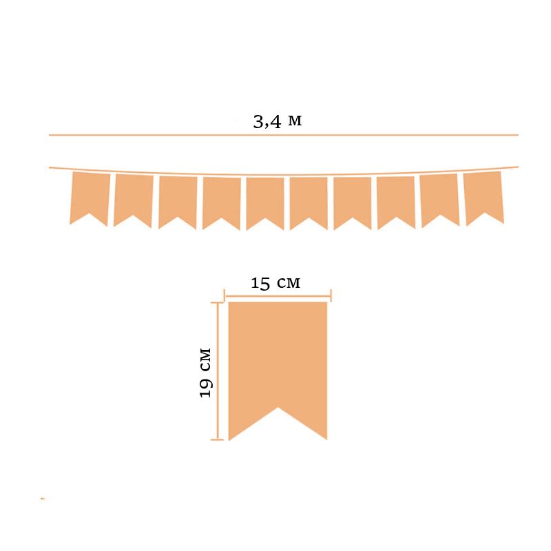Гирлянда состоит из 12 флажков, общая длина составляет 3,4 м, расстояние между флажками 3 см, длина матерчатых флажков 2,1 м, длина лямок с обеих сторон по 50 см