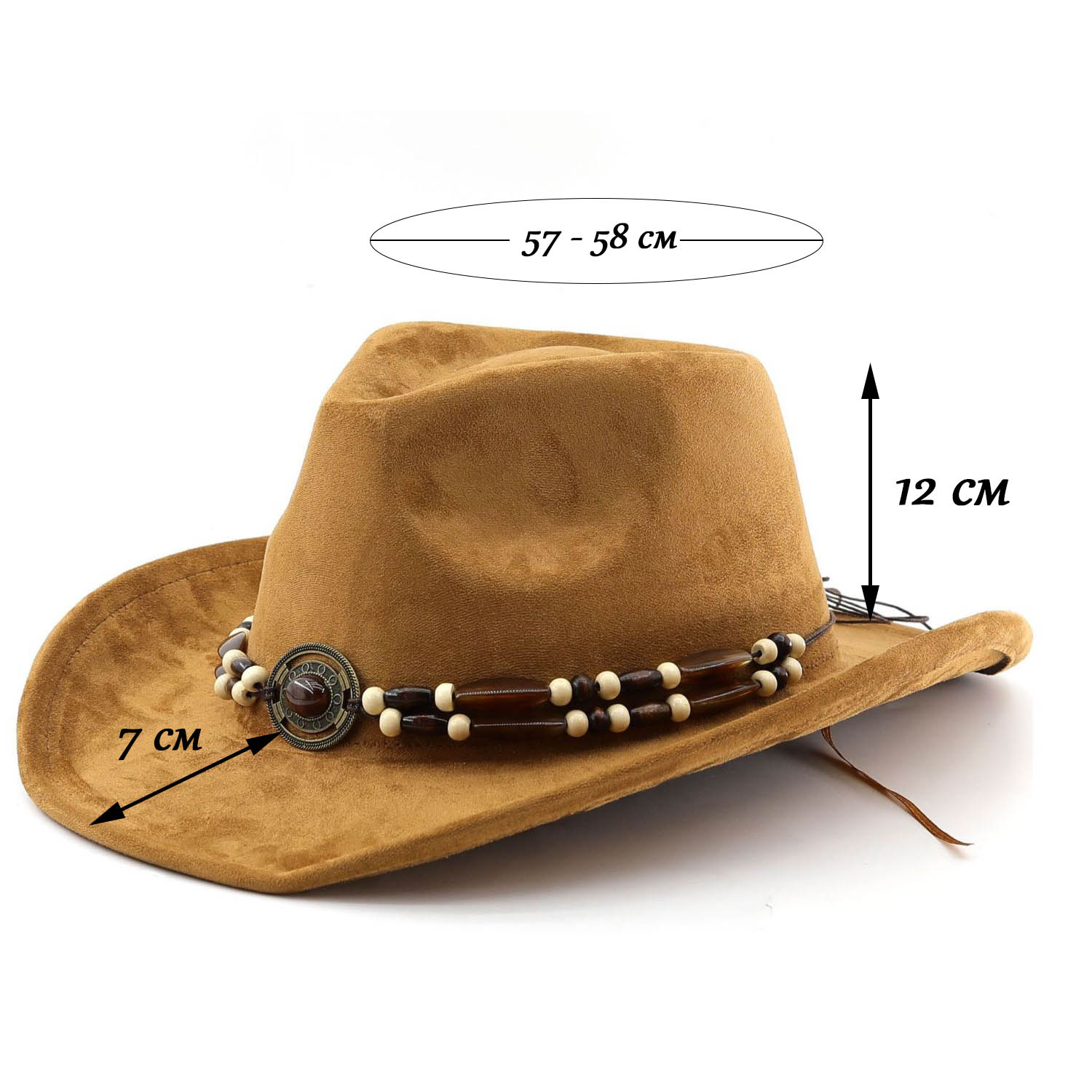 Окружность замшевой ковбойской шляпы: 57-58 см.