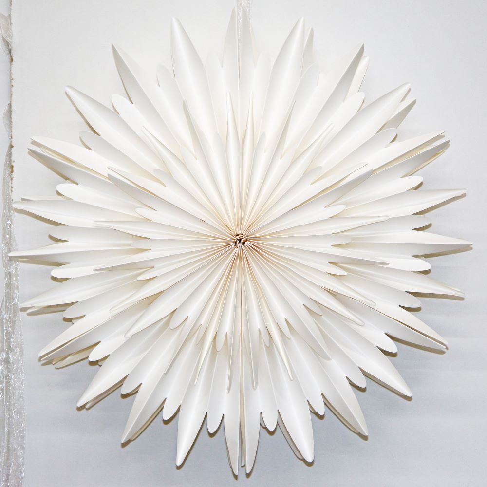 Элегантная объёмная снежинка из плотной бумаги станет стильным украшением зимнего интерьера. Нежный белый цвет придаёт оформлению лёгкость и ощущение снежной свежести, а ажурный узор делает декор утончённым и нарядным.